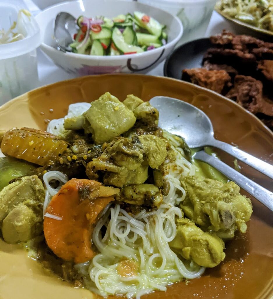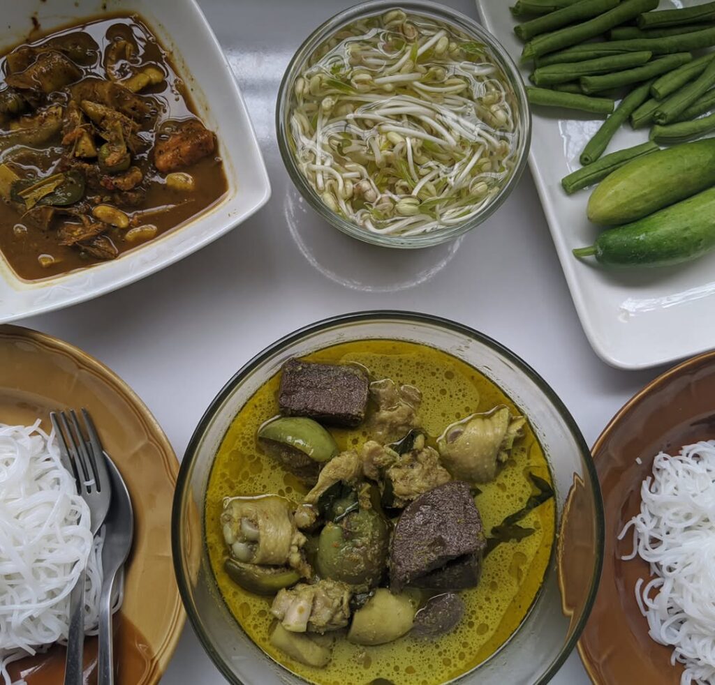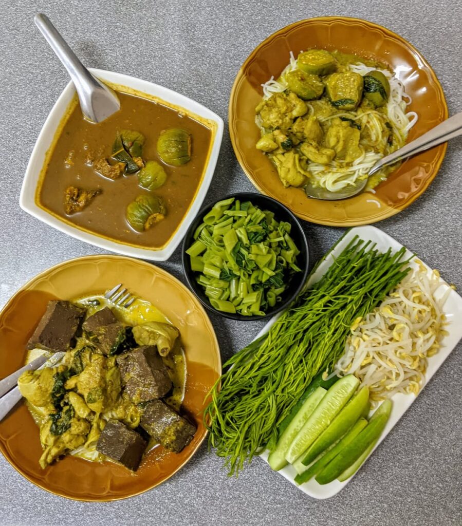 เราเป็นคนที่ชอบกินขนมจีนแกงไก่ที่มีเลือดมาก แต่เดี๋ยวนี้หากินยาก หลายร้านไม่มีเลือด รูมเทมเลยจัดให้ชุดใหญ่ บ้านเราทำแกงไก่มาหลายรอบ รสชาติก็กินได้นะ แบบพอไปวัดไปวาได้ แต่ทำยังไงก็ไม่เหมือนร้าน รู้สึกเหมือนขาดอะไรไปสักอย่าว แต่พอซื้อไตปลาร้านเด็ดๆ มาเสริมก็อร่อยมากขึ้นเลย นัว เข้าที่ อิอิ หน้าตาของที่ทำผ่านๆ มาก็ตามรูปด้านล่างเลย
